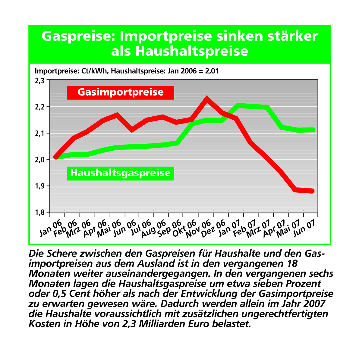 Die Indexwerte des Statistischen Bundesamtes liegen zwischen dem Jahr 2000 und November 2006 im Durchschnitt für Heizöl bei 106 und für Erdgas bei 124 Indexpunkten, bezogen auf den Jahresdurchschnitt 2000 = 100%. Aber bereits in den Jahren vor 2000 waren die Gaspreise stets schneller als die Ölpreise gestiegen, so dass nach Schätzungen des Bundes der Energieverbraucher die Gaspreise derzeit um mindestens 25 Prozent zu hoch sind.