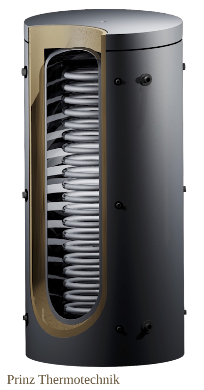 Die bekannteste Lösung sind Warmwasserspeicher mit innen liegender Heizschlange. Bei Einfamilienhäusern enthält er etwa 200 Liter Trinkwasser. Bei einer Beheizung durch Heizkessel genügt eine Fläche der Heizschlange von etwa einem Quadratmeter, denn mit Heizkesseln sind hohe Vorlauftemperaturen möglich. Wärmepumpen dagegen brauchen größere Heizflächen von etwa 0,3 Quadratmeter je Kilowatt Leistung. Bei zehn Kilowatt wären das drei Quadratmeter. Solche Anlagen sind unter dem Begriff »Wärmepumpenspeicher« von vielen Herstellern erhältlich. Sie arbeiten mit einer Vorlauftemperatur, die etwa zehn Grad über der gewünschten Warmwassertemperatur liegt.